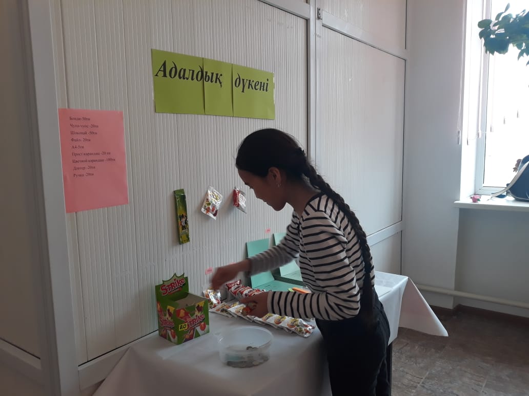 "Адалдық дүкені" жұмысы өзіне-өзі қызмет көрсету жүйесі бойынша ұйымдастырылды. Мұнда оқушылар өздеріне қажетті заттарды алып, алынған тауар үшін ақшаны кассалық жәшікке қалдырып, есеп айырысады.