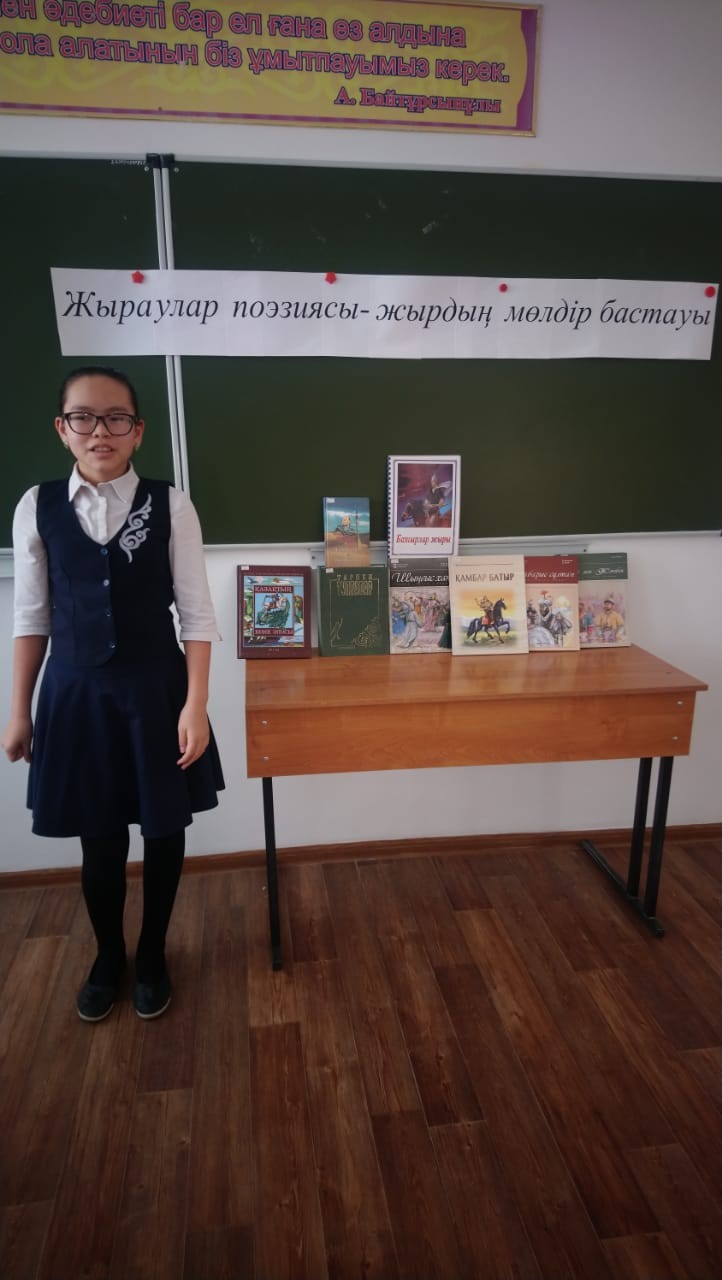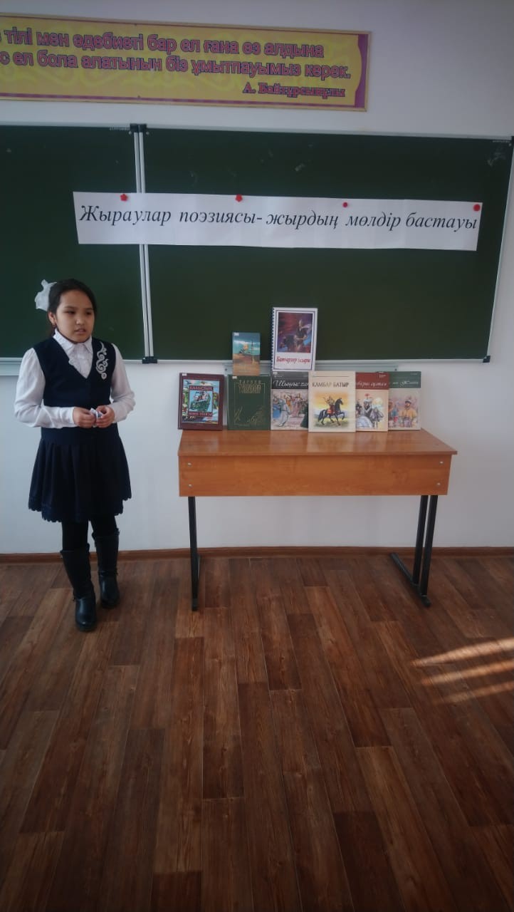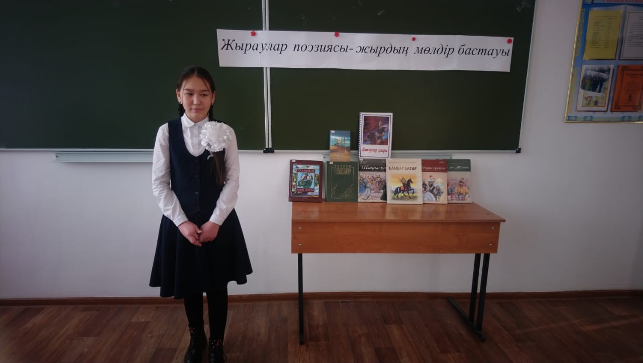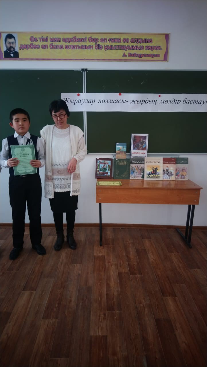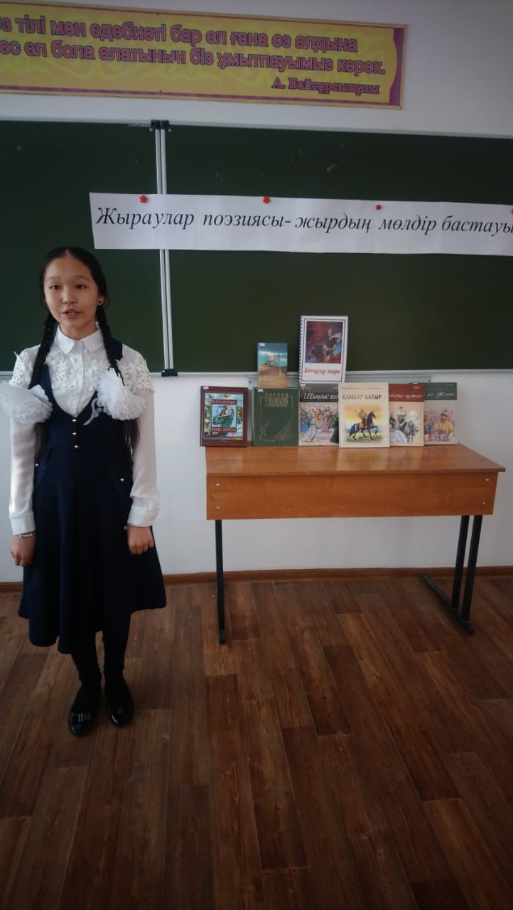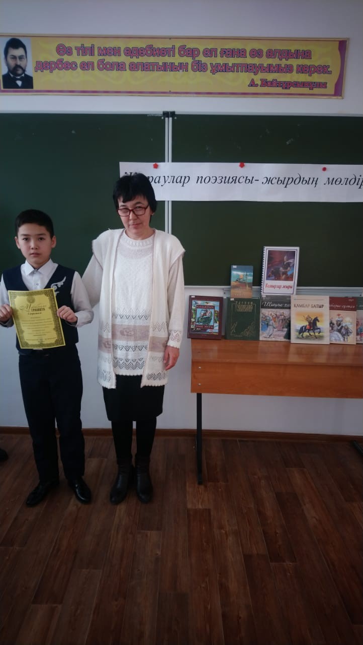 Онда 5а сынып оқушысы Əбдуəли Əділжан "Əй, Махамбет жолдасым" Махамбет өлеңдерін жатқа айтып 1-орынға ие болды. ІІ-орынға ие болған 6а сынып оқушысы Болат Дастан "Доспамбет жыраудың Қоғалы көлдер қом сулар" өлеңін жатқа айтты. 5ə сынып оқушысы Руслан Дастан "Қобыланды батыр" жырын жатқа айтып, ІІІ-орынға ие болды. Жұмашева Дильназ,Мұстафа Дильназ,Таңатарова Асылай "Ақтамберді жырау", Кəукен Дария "Алпамыс батыр", Сəду Аяулым "Батыр Баян", Марат Нұрай "Алпамыс Батыр", Демеу Нұрбақыт "Қобыланды батыр" жырларын айтуда белсенділіктерін көрсете білді.
