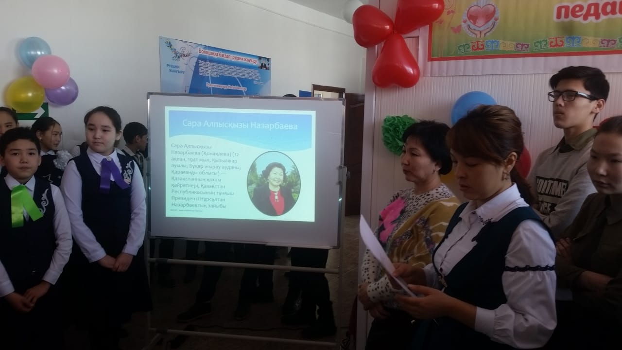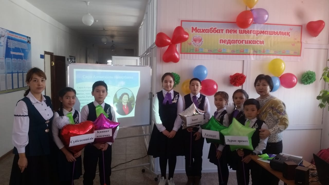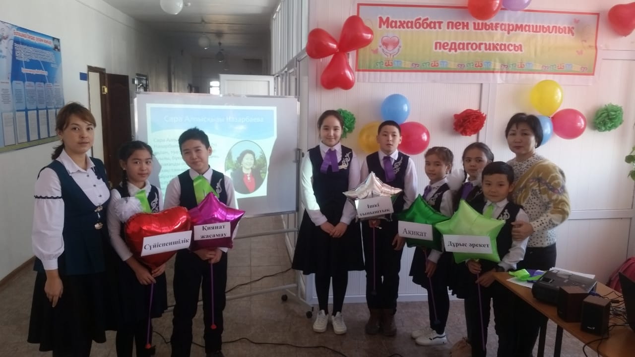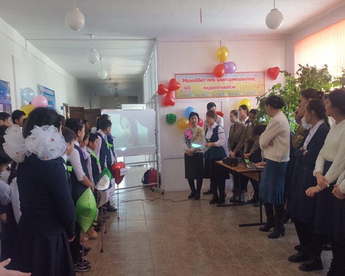 1-ақпан күні 5-11 сыныптар арасында «Өзін-өзі тану: Махаббат пен Шығаршашылық педагогикасы» онкүндігінің ашылуына орай саптүзеу өткізілді. Саптүзеуде өзін-өзі тану пәні мұғалімі Жумагалиева М.С. және Умбетова З.А. Сара Алпысқызының өмір жолынан таныстырылым жасап, Жумагалиева М.С. жетекшілік ететін 5 «а» - сынып оқушыларына алдын-ала берілген Сара Алпысқызы Назарбаева және «Өзін-өзі тану» пәні туралы тақпақтарды жатқа айта отыра, караоке бағытында дайындалған Қарақат Әбілдинаның «Аяулы ана» әні шырқалды.