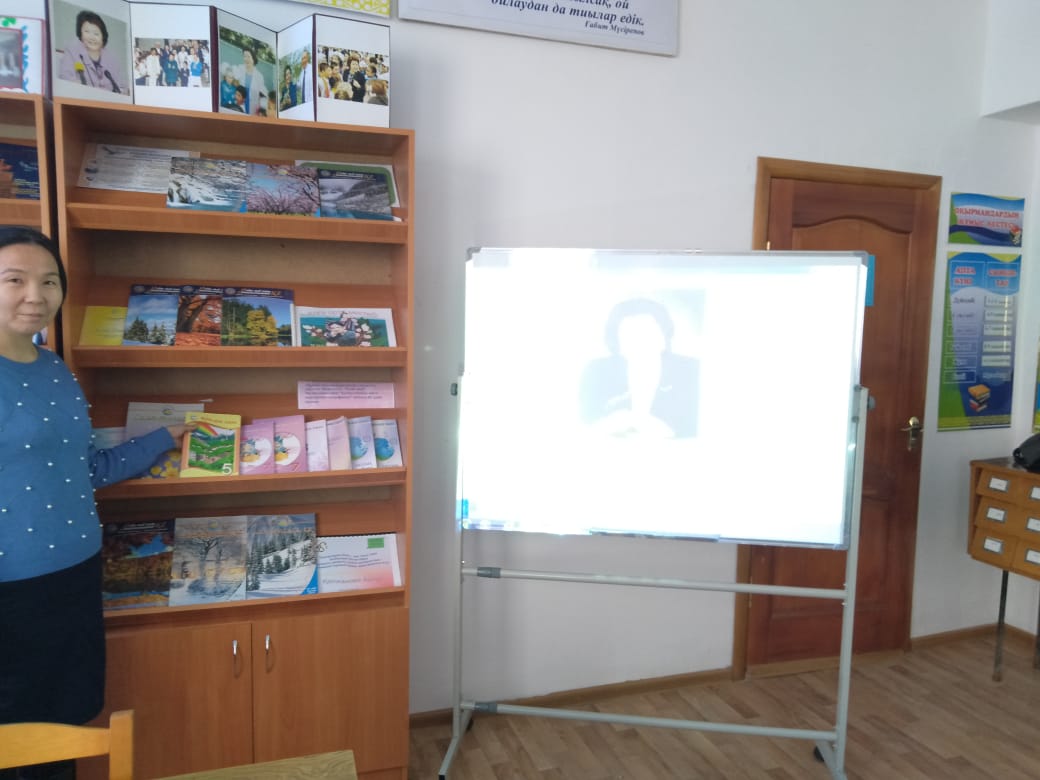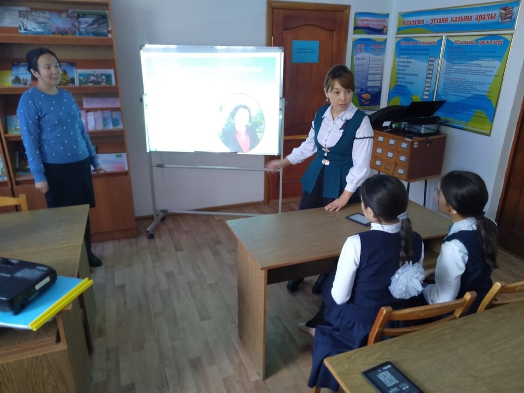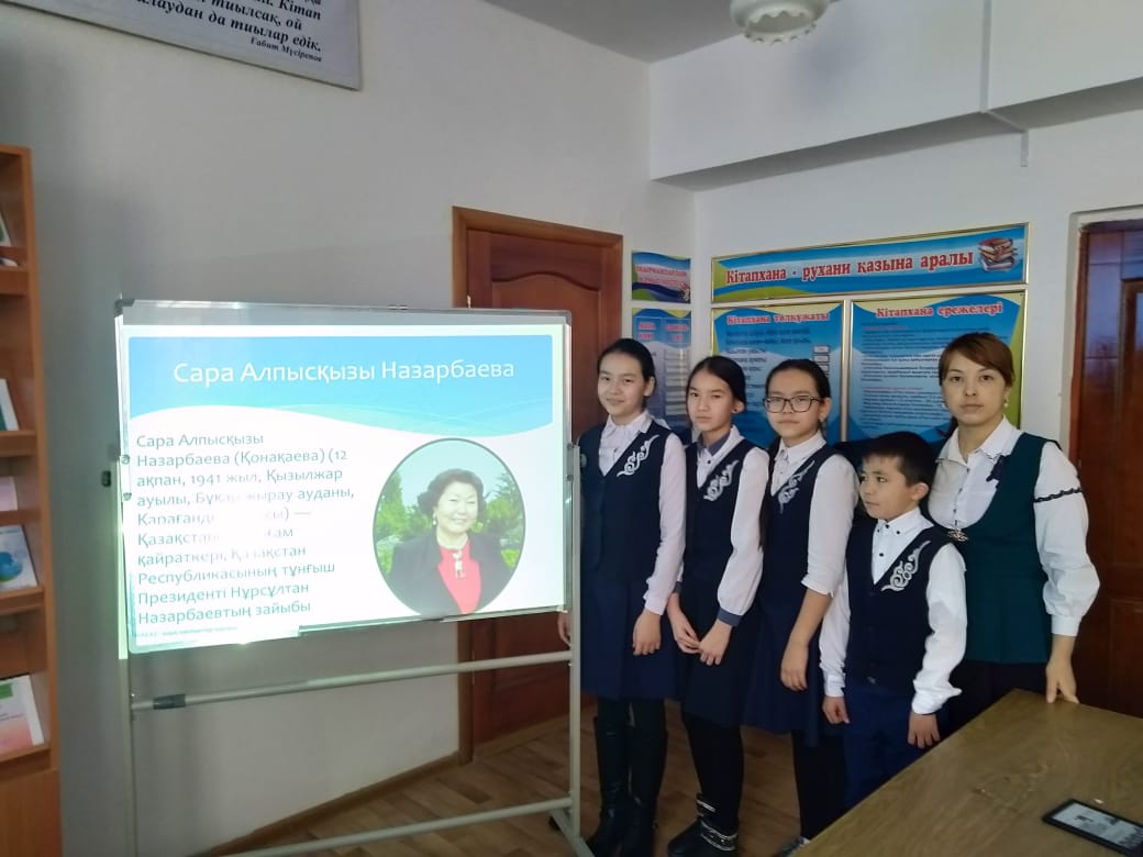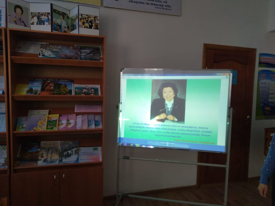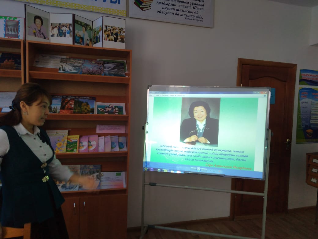 5-ақпан күні кітапханада «Өзін-өзі тану» адамгершілік-рухани бағдарламасының авторы С.А.Назарбаеваның қызметі туралы,оның ішінде автордың жазған кітаптары мен шығармаларының көрмесін ұйымдастырылды. Оған жауапты мектеп кітапханашысы Көшенова Раухан және өзін-өзі тану пәні бірлестік жетекшісі Жумагалиева Мая. Аталған жоспар бойынша жұмыс 7 «ә»- сынып оқушыларымен жасалды. Оқушылар Сара Алпысқызы Назарбаева өмірі мен қатар оның шығармаларына деген қызығушылықтарын танытты. Жоспар бойынша жасалған жұмыстың ерекшелігін атап айтар болсақ, оқушылар мектеп кітапханасына келген электронды оқулықтармен және планшеттермен қазіргі заман талабына сай жұмыс жүргізе білді, оқушылар өздері осы құрылғылар арқылы Сара Алпысқызы туралы қосымша ақпараттарды қарап, кең ауқымды жұмыс жүргізе білді.