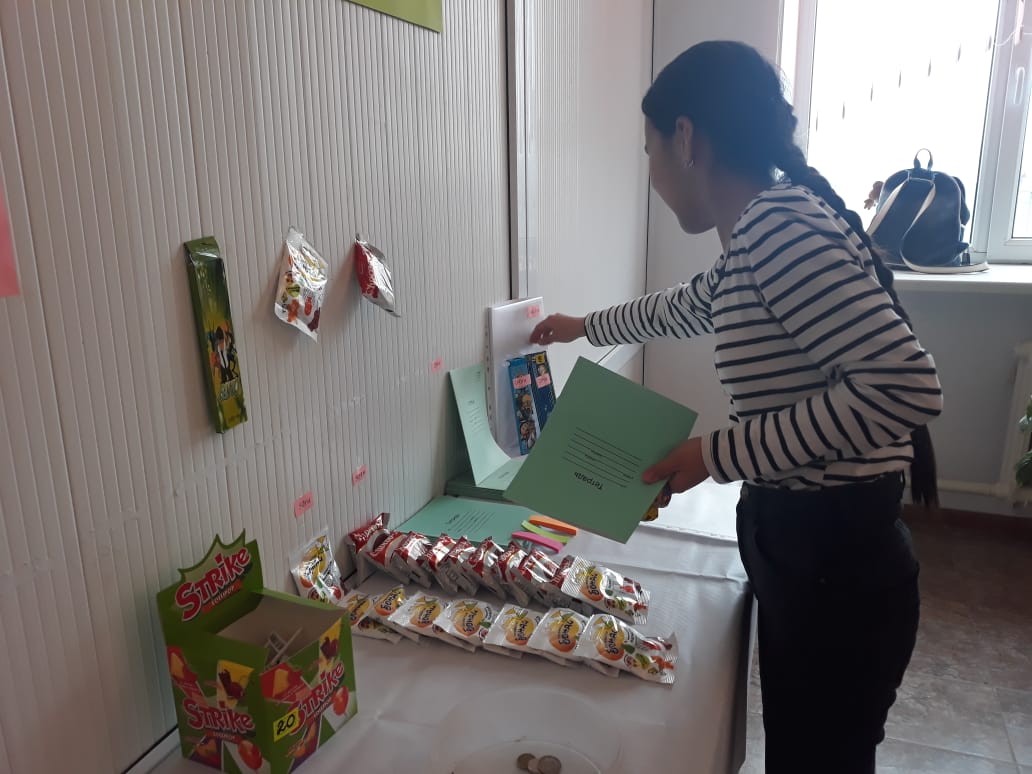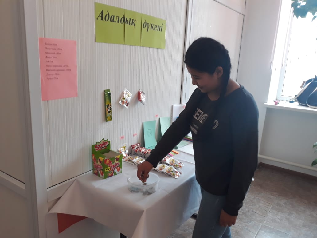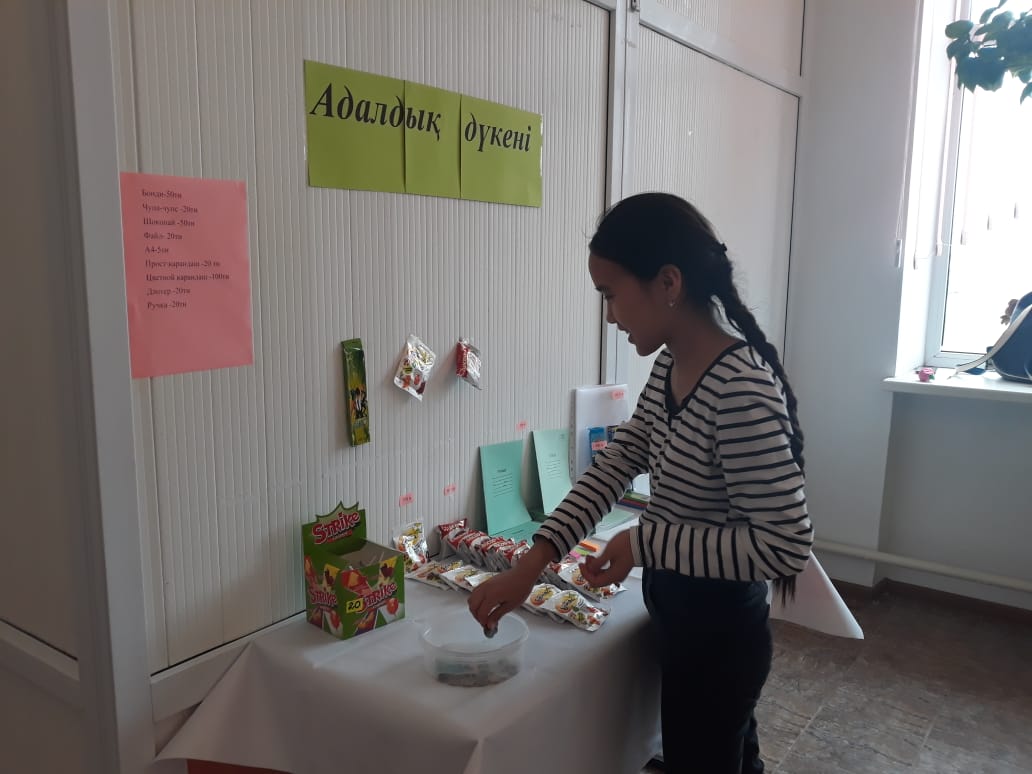 "Адалдық дүкені" жұмысы өзіне-өзі қызмет көрсету жүйесі бойынша ұйымдастырылды. Мұнда оқушылар өздеріне қажетті заттарды алып, алынған тауар үшін ақшаны кассалық жәшікке қалдырып, есеп айырысады.