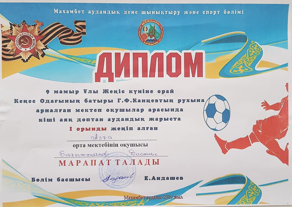 9 мамыр Ұлы Жеңіс күніне орай Кеңес Одағының батыры Г. Ф. Канцевтың рухына арналған мектеп оқушылар арасында Алға орта мектебінің дене шынықтыру пәні мұғалімі Кушетеров Өзеркіннің жетекшілік етуімен кіші аяқ доптан аудандық жарыстан оқушыларымыз жүлделі 1 орын иеленді. Сонымен қатар, Мусин Рустемнің жетекшілігімен Қ.Р.-на еңбегі сіңген жаттықтырушы Өтеғалиев Марат Өтеғалиұлын еске алуға арналған 2003-2005 жылғы жасөспірім ұлдар арасында өткен валейболдан облыстық ашық турнирде жүлделі 3 орын иеленді. Мектебіміздің спорт саласындағы жетістіктері мен табыстары арта берсін!